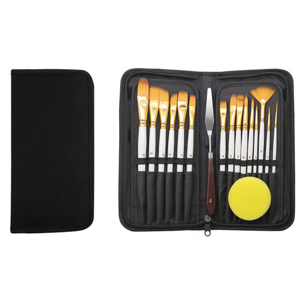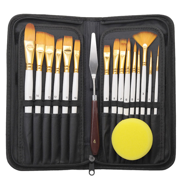 Versatile 15-piece brush set with pop-up storage brush stand, ideal for watercolour, acrylic, and oil painting.