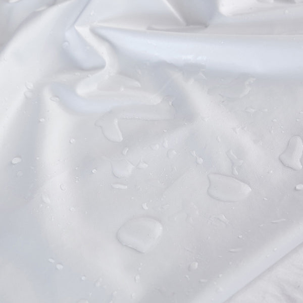 A durable white waterproof mattress protector with full perimeter zipper and elasticized fit. Features a soft polyester surface and inner TPU barrier to block liquids, ideal for pets or allergy sensitive households.
