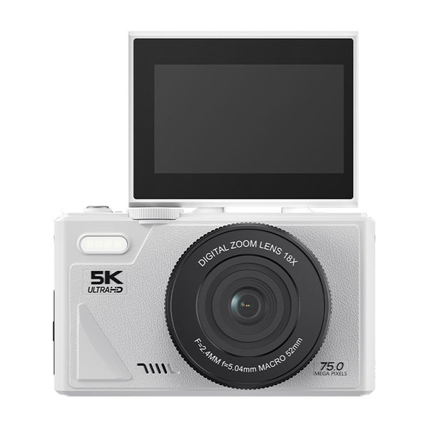 A versatile 5K digital camera featuring a 180-degree flip screen, perfect for capturing high-quality photos and videos from any angle.