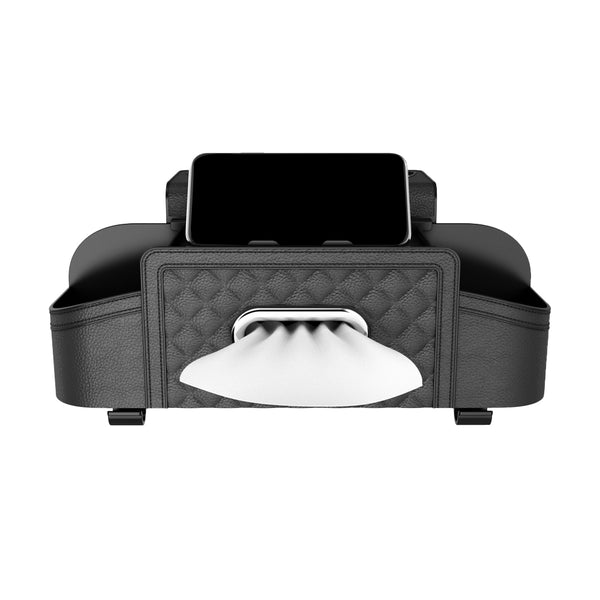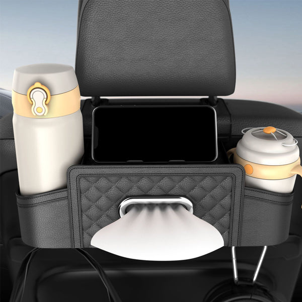 This car back seat organizer features a built-in tissue box, cup holders and hook to keep all your essentials within reach.