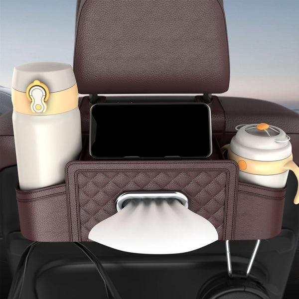 This car back seat organizer features a built-in tissue box, cup holders and hook to keep all your essentials within reach.