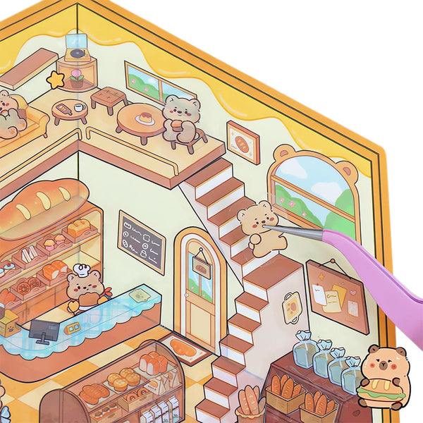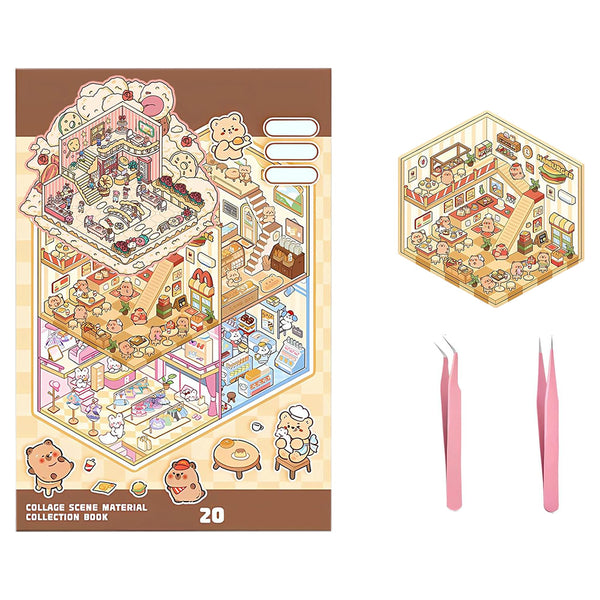 Unleash your creativity with this immersive 3D sticker scene book, featuring 20 themed backgrounds, 30 high-definition PET stickers, and 2 precision tweezers.