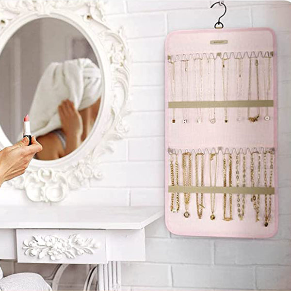 This double sided hanging jewelry organizer has plenty of space to store jewelry.