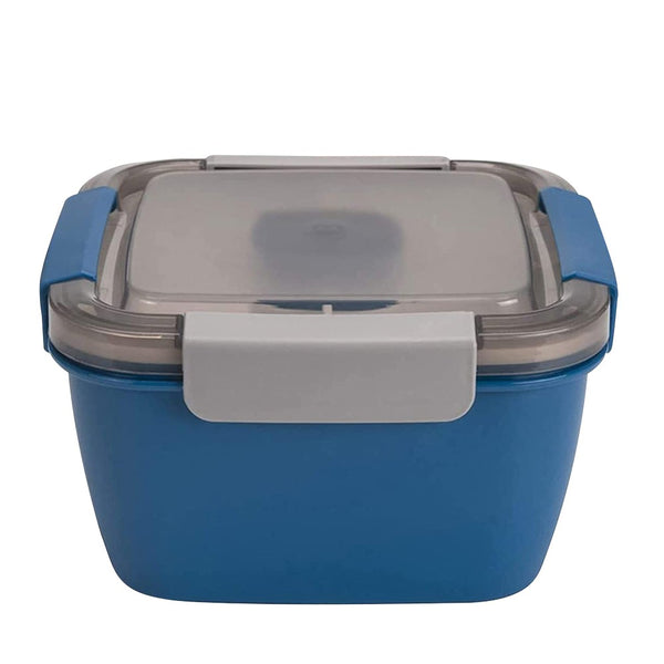This reusable container features an airtight lid with 4 side snapping clamps and features double layer design, large capacity and detachable, ideal storage for holding lettuce, dressing and toppings