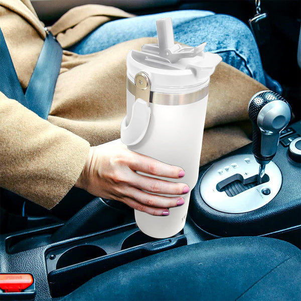 The 30oz flip straw stainless steel tumbler features vacuum insulation to keep drinks at the perfect temperature, with a convenient flip straw for easy sipping on the go.