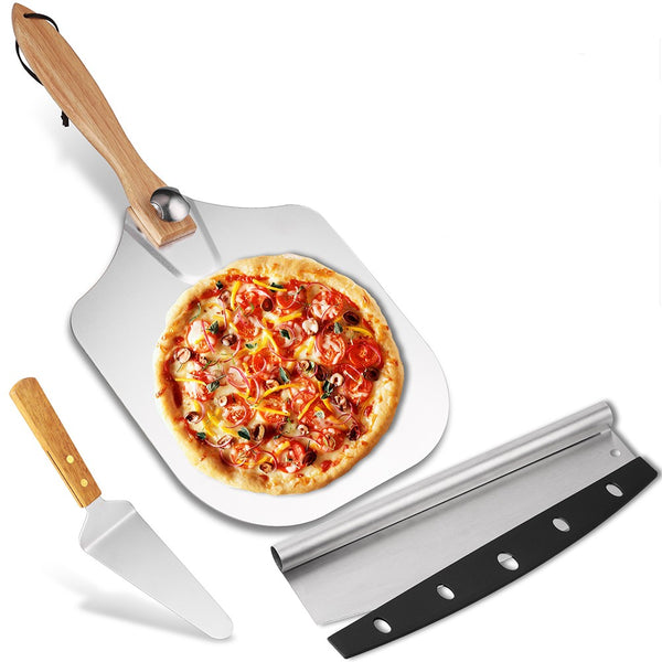 - This pizza peel set includes a pizza paddle, a rocker cutter, and a pizza spatula, providing all the essential tools you need for baking and serving pizza.