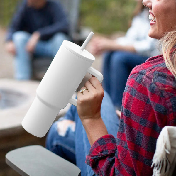Insulated cup with handle and straw lid is easy to carry and use, suitable for sports, travelling, self-driving, barbecue, camping, party and other occasions.