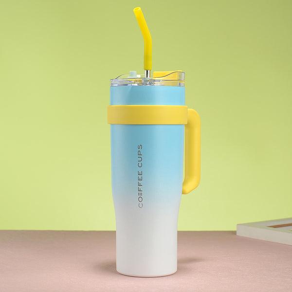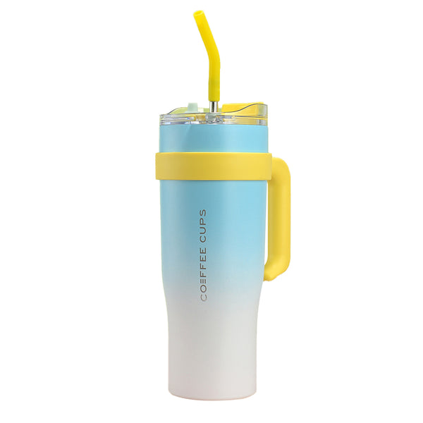 This stainless steel tumbler combines a high-capacity design, portable handle and reusable straw to provide a convenient drinking experience.