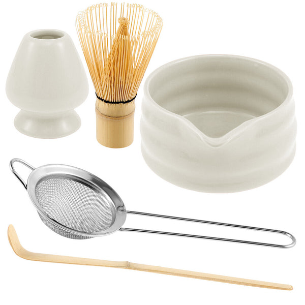 5-Piece Set Traditional Matcha Tea Tools Bamboo Whisk Ceramic Bowl Accessories for Matcha Brewing White