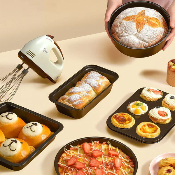 - This professional set includes an 8-inch cake mold with a removable bottom, 8-inch square pan, 9-inch round cake pan, 6-cup muffin pan, and 25cm toast mold, catering to all your baking needs.