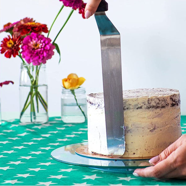 • You can use straight spatula for icing round cakes from the sides and a curved spatula from the top while rotating the turntable.