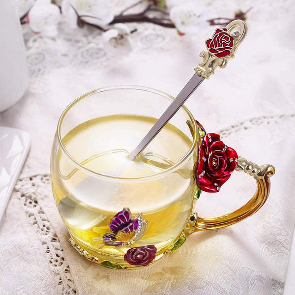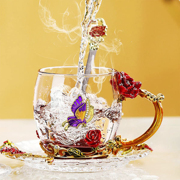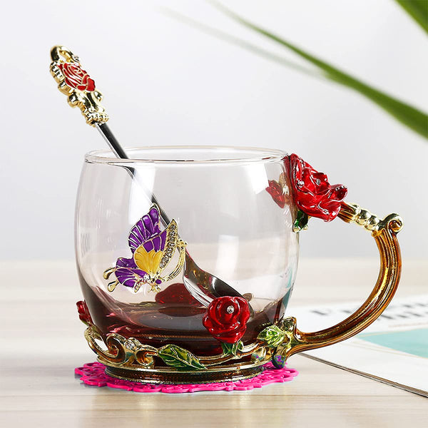 The handmade enamel glass tea cups has an elegant style with butterfly and rose flower 3D designs, with a beautiful coaster designed for you.Its wonderful combination of art and practicality.