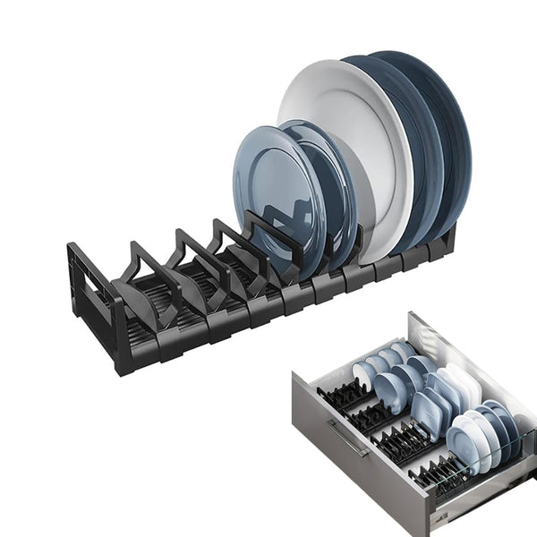 This aluminum adjustable cabinet dish drainer allows for the secure placement of dividers as needed, optimizing cabinet space and facilitating easy retrieval of dishes directly from the rack.