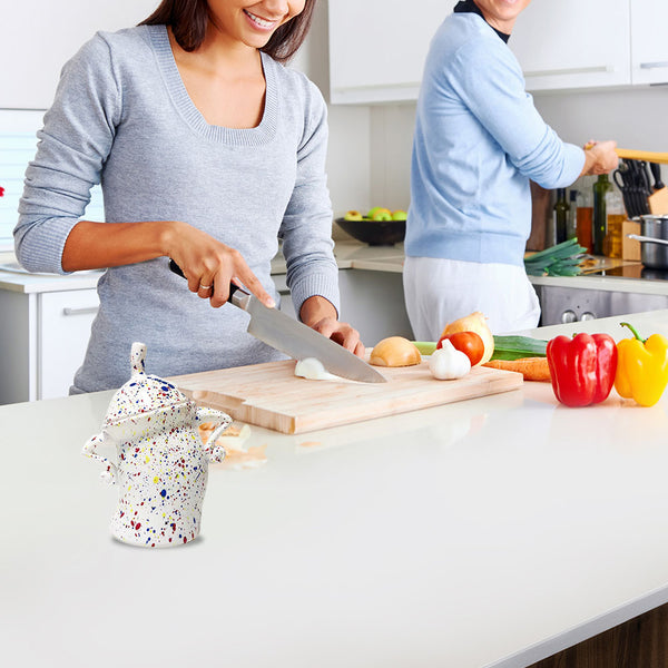 With its "hands on the waist" pose and vibrant creative patterns, this canister brings color, style, and personality to your living space.