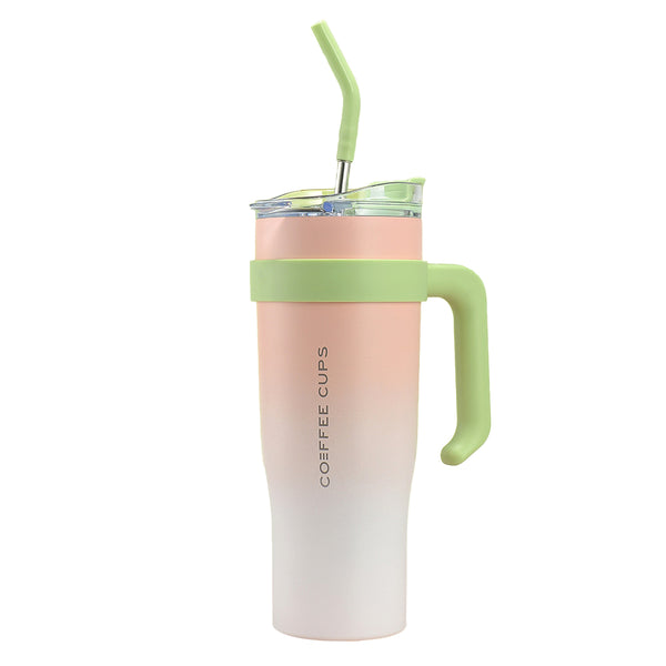 This stainless steel tumbler combines a high-capacity design, portable handle and reusable straw to provide a convenient drinking experience.