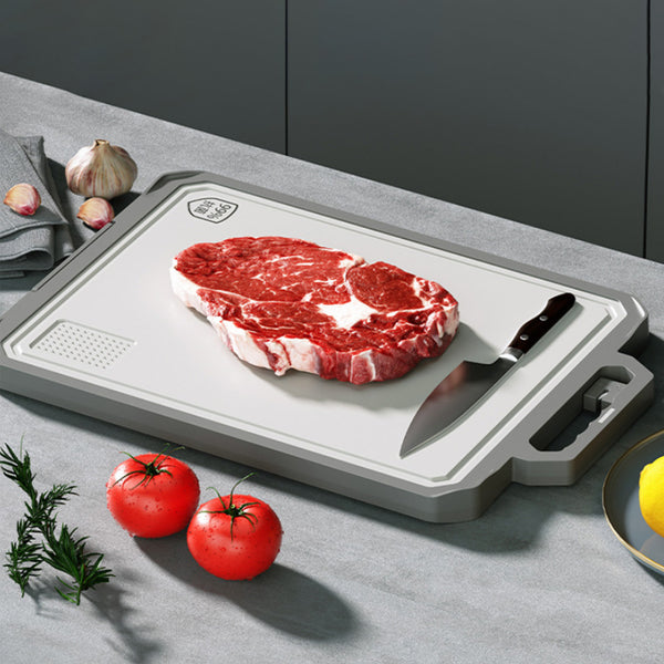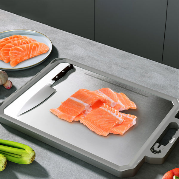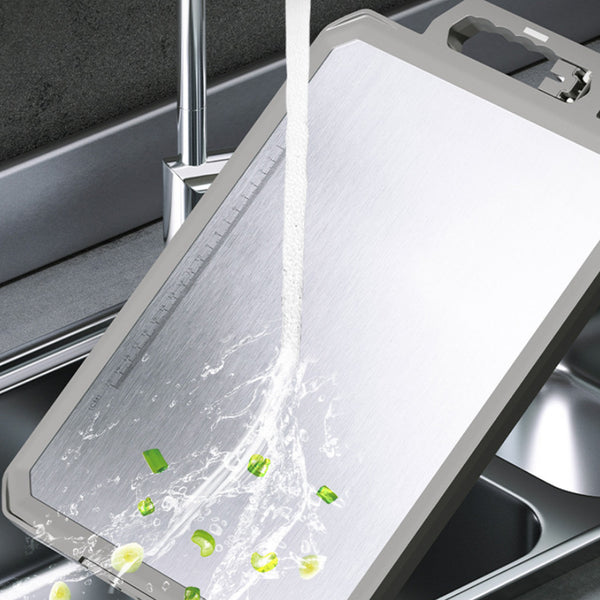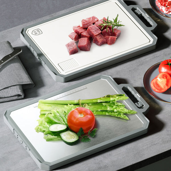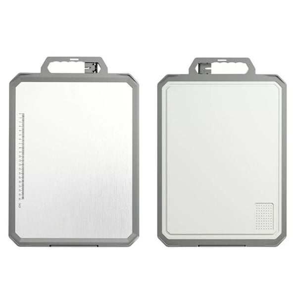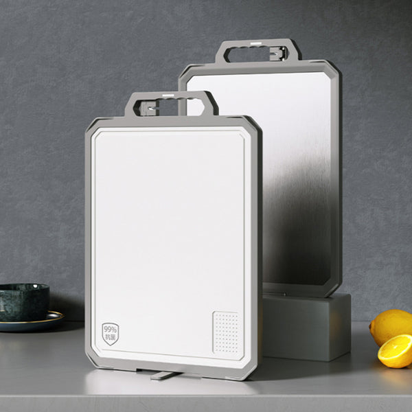 This stainless steel double-sided cutting board features an antibacterial surface, hanging handle, standing design.