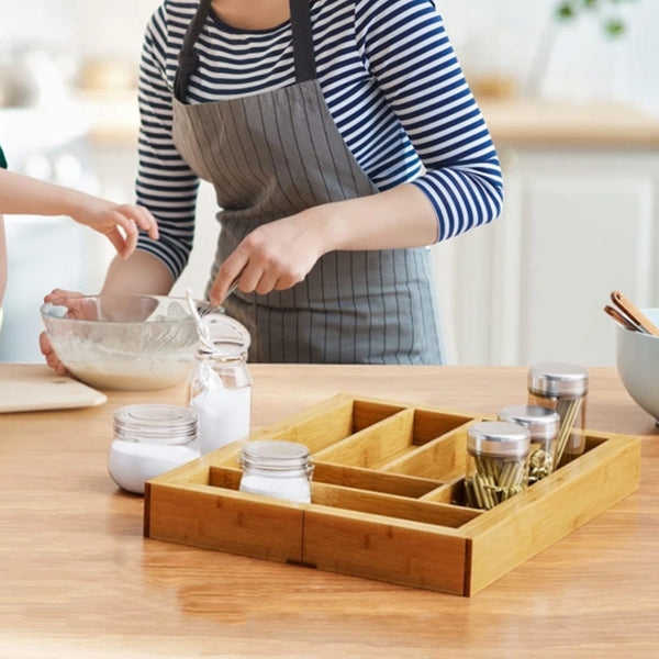 Keep your kitchen drawers neat and organized with the kitchen drawer organizer. Made from natural bamboo, this elegant and functional drawer tray offers smart storage solutions for cutlery, utensils, and kitchen tools.