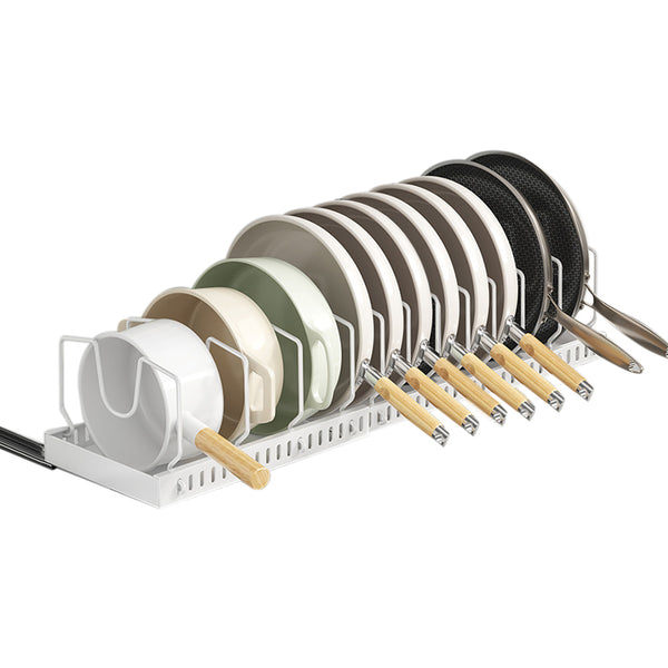 • With 12 M-shaped brackets, providing 40-60cm of horizontal extension space, suitable for storing pot lids, frying pans, chopping boards, baking trays, etc.