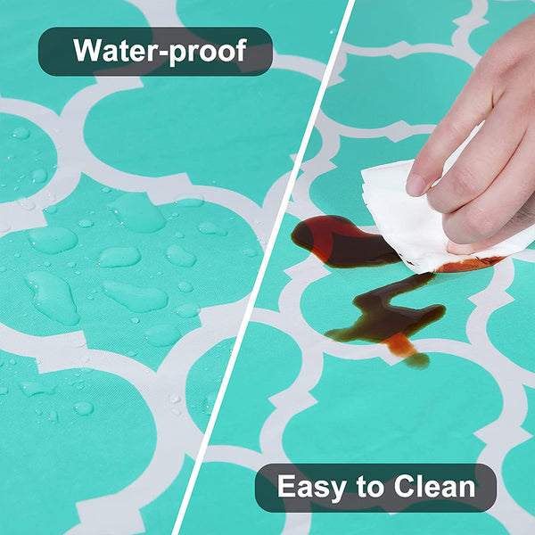 - The water resistant durable coating makes our tablecloths super easy to clean. Just take a damp sponge or cloth and wipe clean.