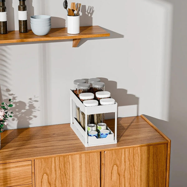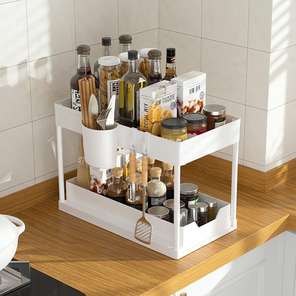 The kitchen cabinet organizer with 4 hooks and small storage box supports drawer pull-out and keep your under sink cabinet, pantry room and counter top organized neatly.