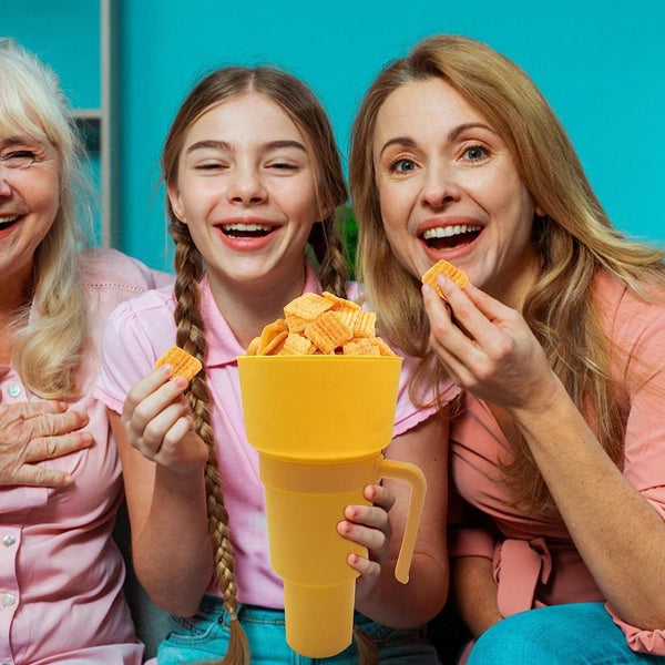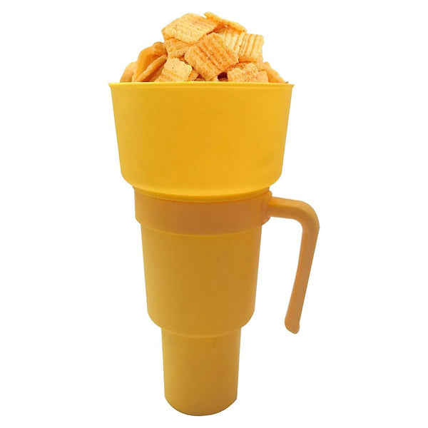 - 2-in-1 design, composed of a cup and a snack bowl.