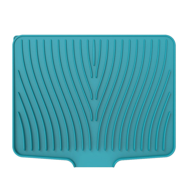 Quick-drying dish mat with raised, foldable design that promotes airflow and directs water straight into the sink to keep your countertop dry.