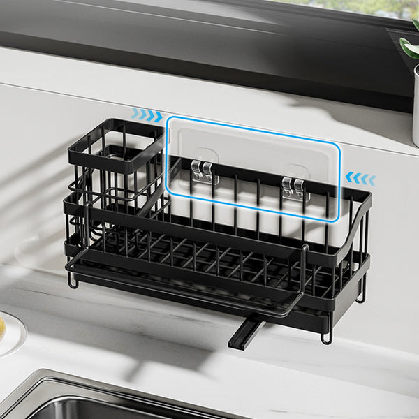 The iron sponge rack with brush holder is designed to keep countertops dry and organized.