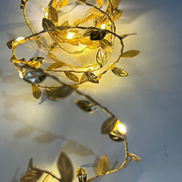 Adorn your space with these string lights featuring golden leaf-shaped bulbs, adding a warm, elegant glow to any setting.