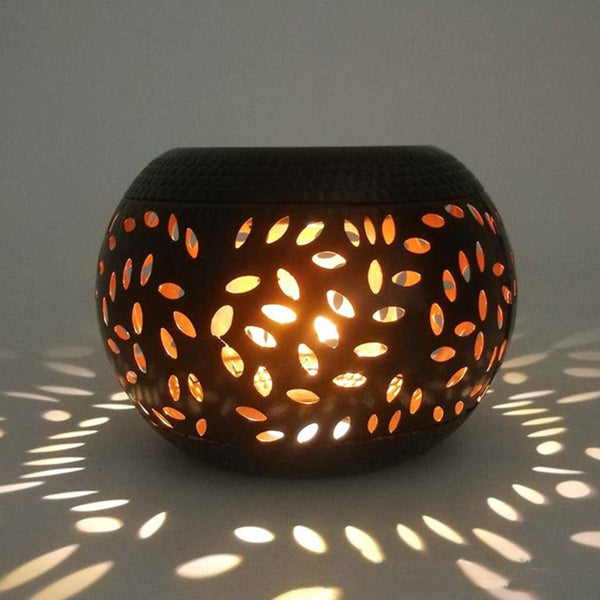 This solar lamp with a vintage metal hollowed-out surface that casts a bright, warm pattern of light in the dark, which can add an elegant and chic ambiance to gardens and porches.