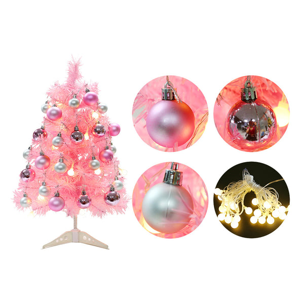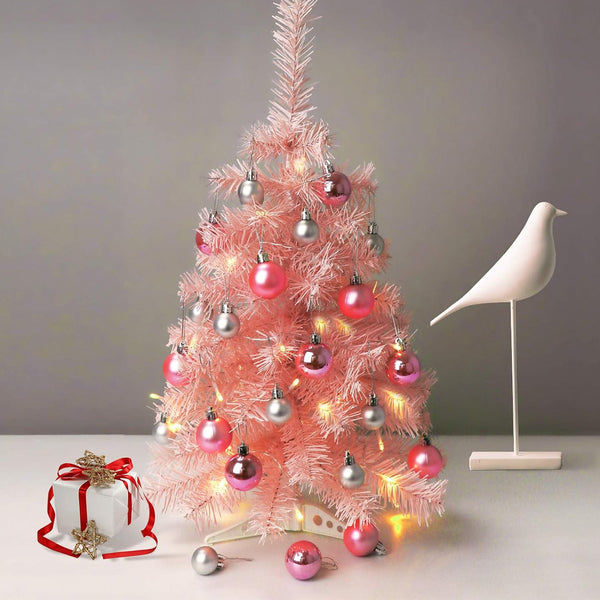 - Includes A mini pink Christmas tree, 14 Christmas balls (3 bright pink, 3 matte pink, 8 silver), and a string of LED lights