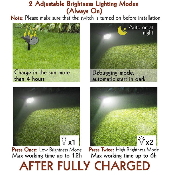 Features 20 POWERFUL LEDs to Light Up Your Yard with Light. Have 2 BRIGHTNESS LIGHTING MODES (Always on): High Bright (6hrs) & Low Bright (12hrs).