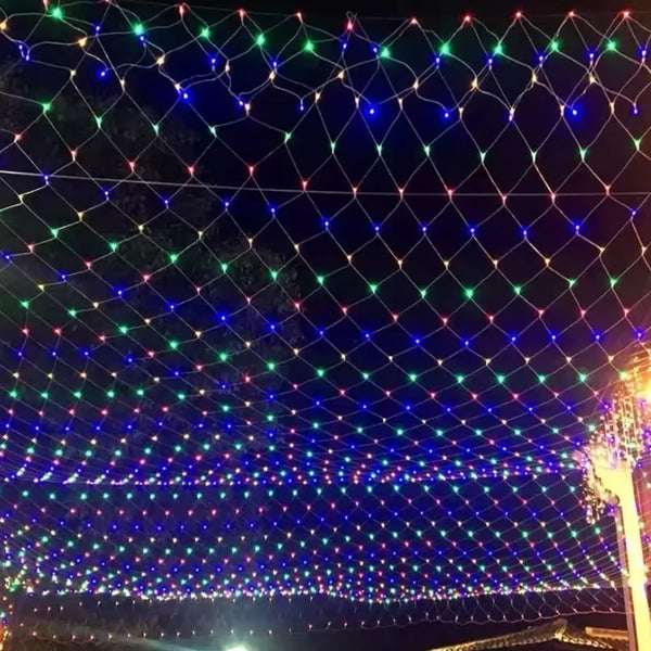 Outdoor LED net mesh lights with 192 LEDs, 8 modes, and dual power options, perfect for festive and everyday decoration.