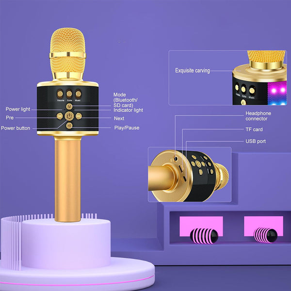 Wireless Bluetooth Karaoke Microphone with LED Lights Home Party Singing Mic Gold