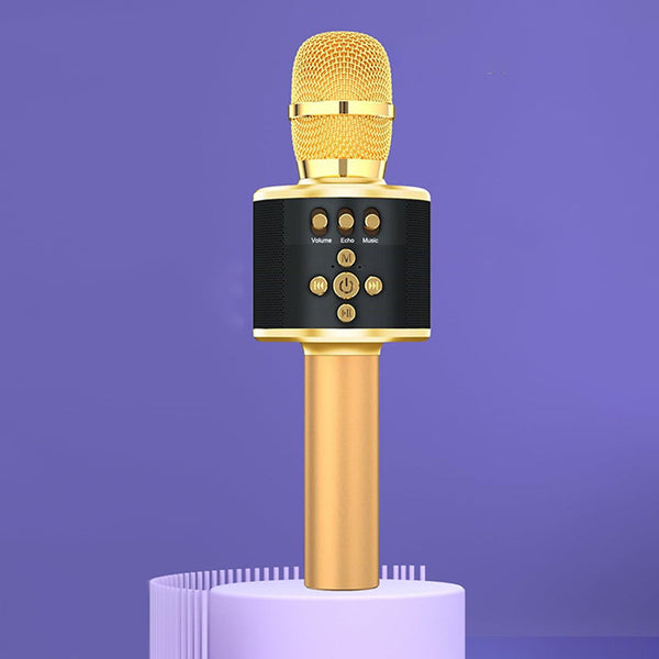 A wireless Bluetooth karaoke microphone with a built-in speaker, USB compatibility, and versatile playback modes for singing and audio entertainment.