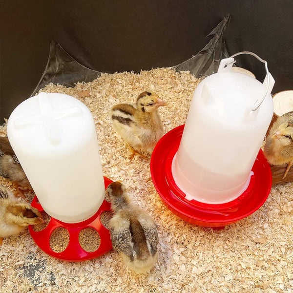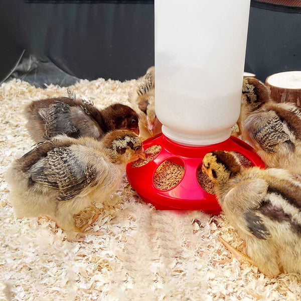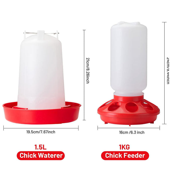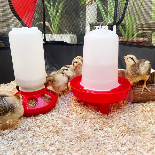 - Our chick waterer and feeder can fit in your chick brooder enclosure and large enough that you won't need to constantly refill.