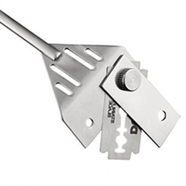 - No extra tools are needed for installation. Simply screw the handle onto the extension rod and insert the blade between the scraper head and stainless steel plate for quick and secure assembly.