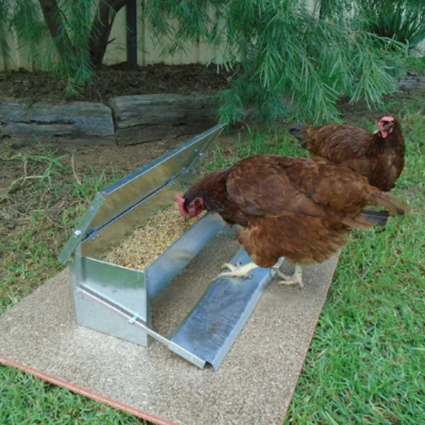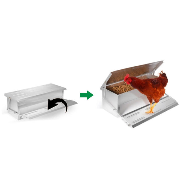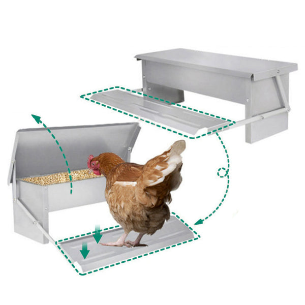 • Self-Opening Top Cover: The foot pedal mechanism allows chickens to easily activate the feeder. The top cover automatically opens when a chicken weighing more than 500g steps on the pedal. Chickens under 500g won’t be able to open it.