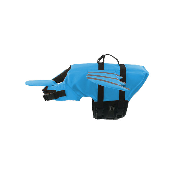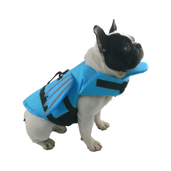 - The dog life jacket with bright safety colors and reflective bands to enhance visibility.