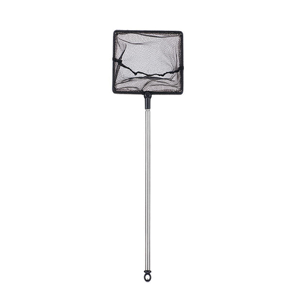 Aquarium fish net with a telescopic handle and a sturdy rectangular nylon frame, perfect for easy fish scooping and tank cleaning.