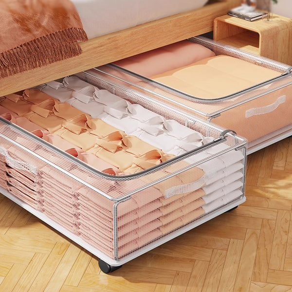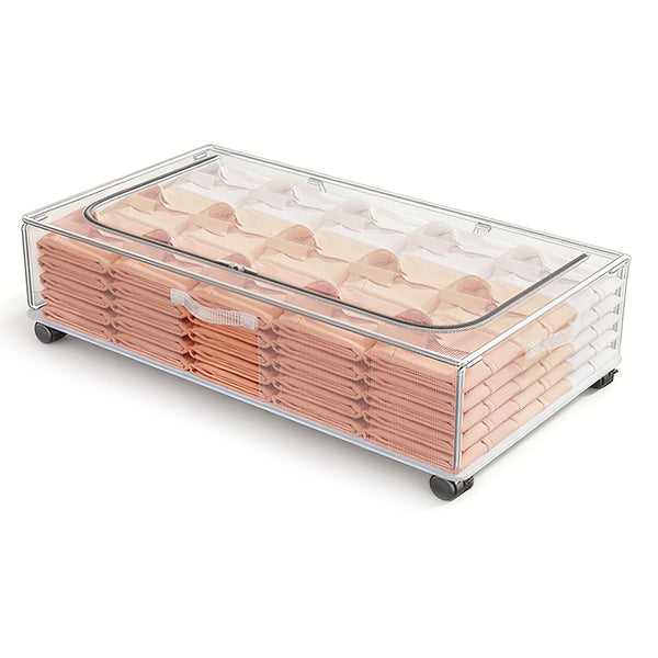 Under-bed storage containers with wheels and lids, ideal for organizing shoes, clothes, blankets, and seasonal items while maximizing space under your bed or furniture.