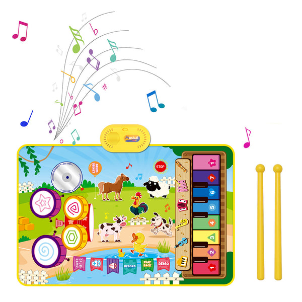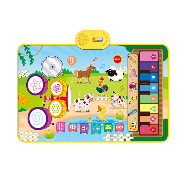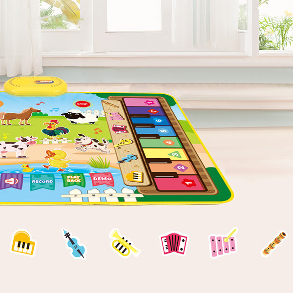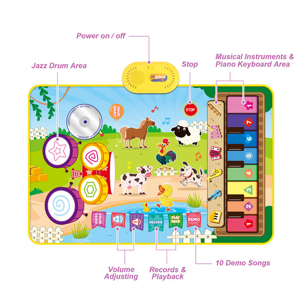 • This music mat boasts 19 instrumental buttons, including 8 Piano Keys, 4 Bass Drum, 6 instrument Switch and 1 Crash Cymbal.