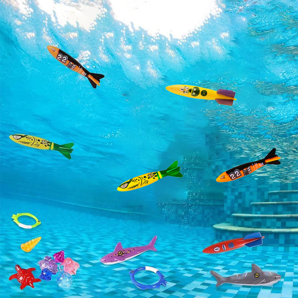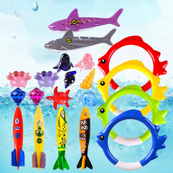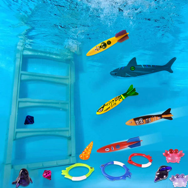 - This swimming toys include 8 transparent sea animals, 4 torpedo, 4 diving rings, 2 diving sharks, 2 diving gems.
