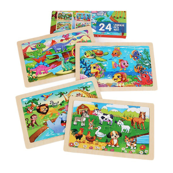 A set of 4 wooden puzzles with 24 pieces each, designed for preschoolers to enhance cognitive and problem-solving skills through fun and educational jigsaw play.