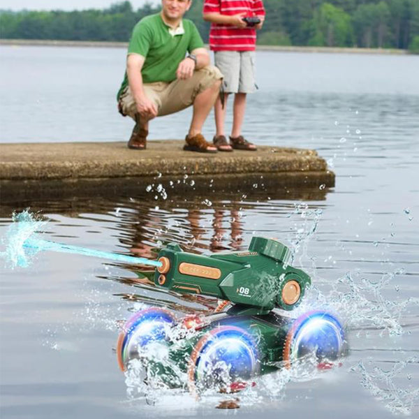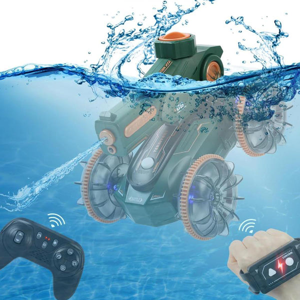 With the unique design, the amphibious remote control car boat functions as an RC car, RC boat, and water gun for maximum fun on both land and water.