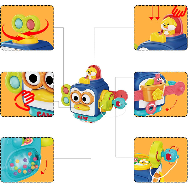 The cute penguin activity cube is a Montessori educational toy designed to engage kids with interactive features that promote sensory development and fine motor skills.
