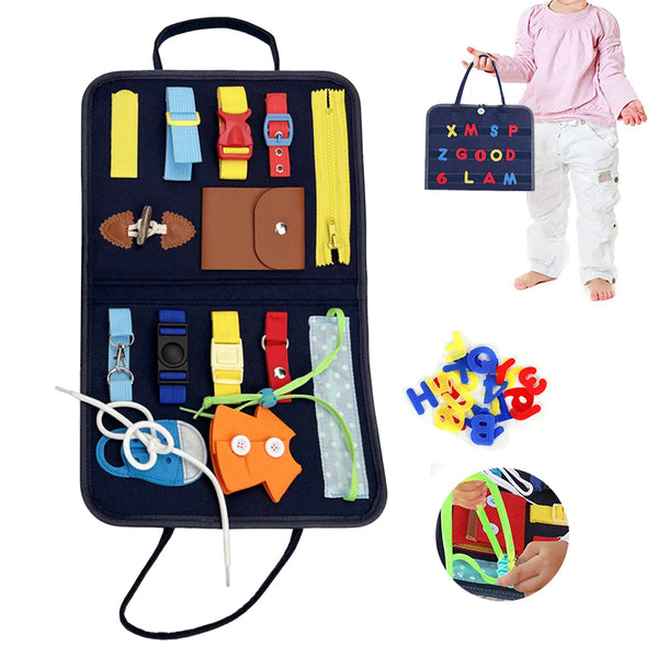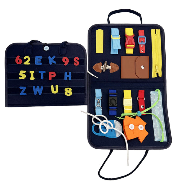 This busy board for toddlers features 14 different varieties of buckles, zip pocket, lace and etc, with a set of hook and loop alphabet and number letters. A great toy for children to explore by themselves! It is also an ideal parent-child interactive toy!