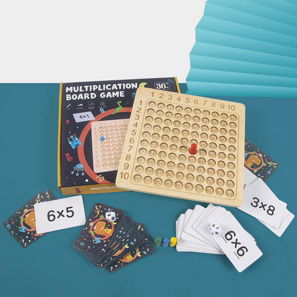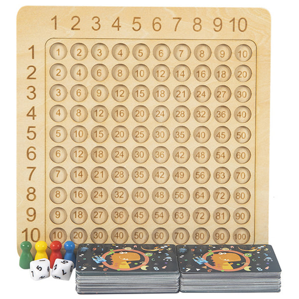 - Includes 1 multiplication board, 2 dices, 4 wooden pawns pieces, 100 math cards.