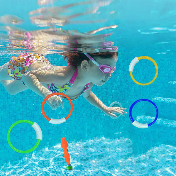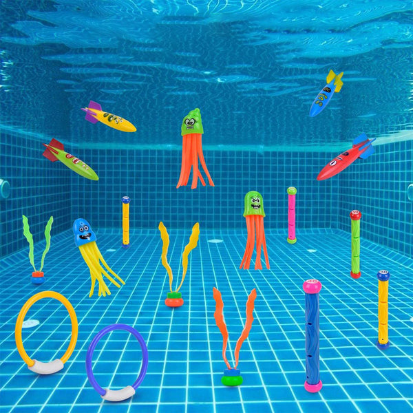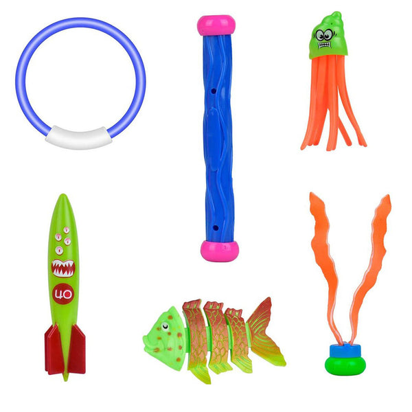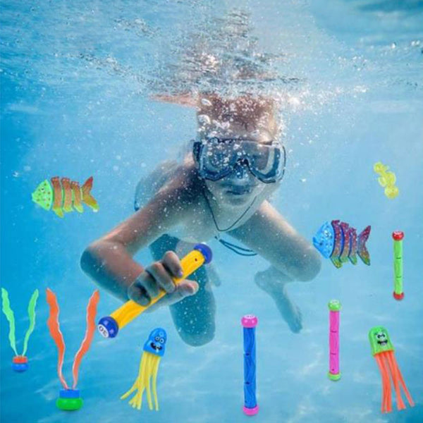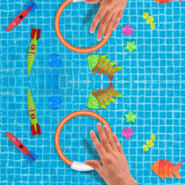The kids and pets pool diving toys set includes vibrant, durable toys that enhance fun and swimming skills for both kids and pets during pool playtime.