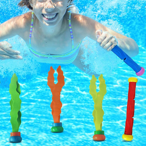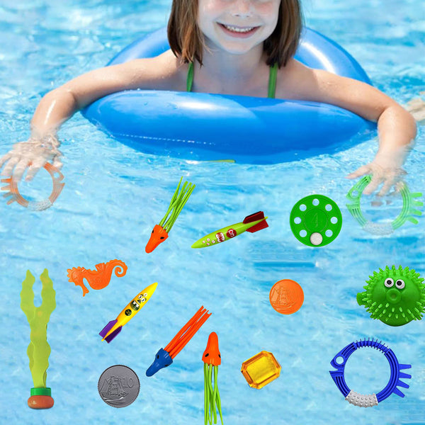 The kids and pets pool diving toys set includes vibrant, durable toys that enhance fun and swimming skills for both kids and pets during pool playtime.