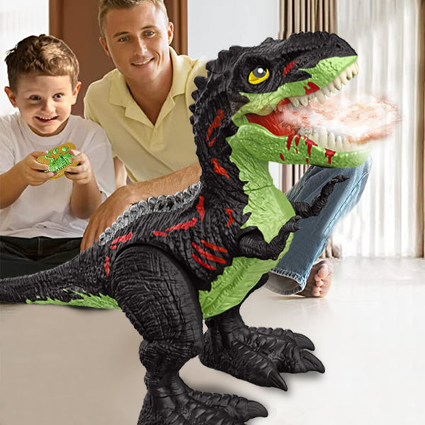 The head of the dinosaur can be controlled to swing left and right with a remote control or a watch, and it also has a spray function.